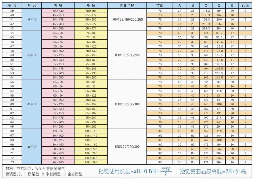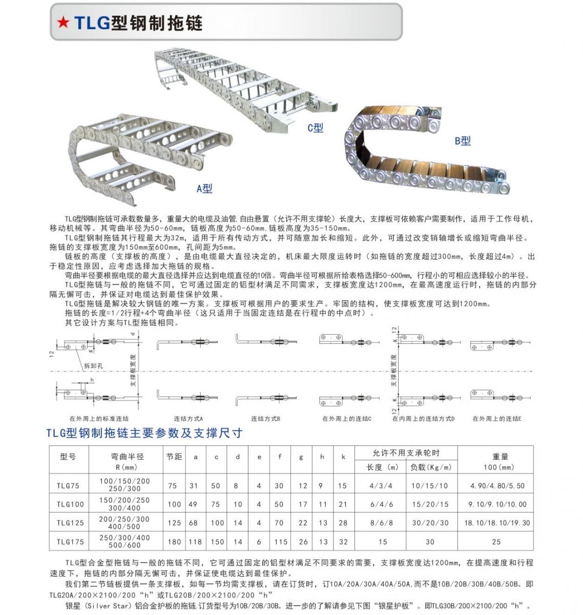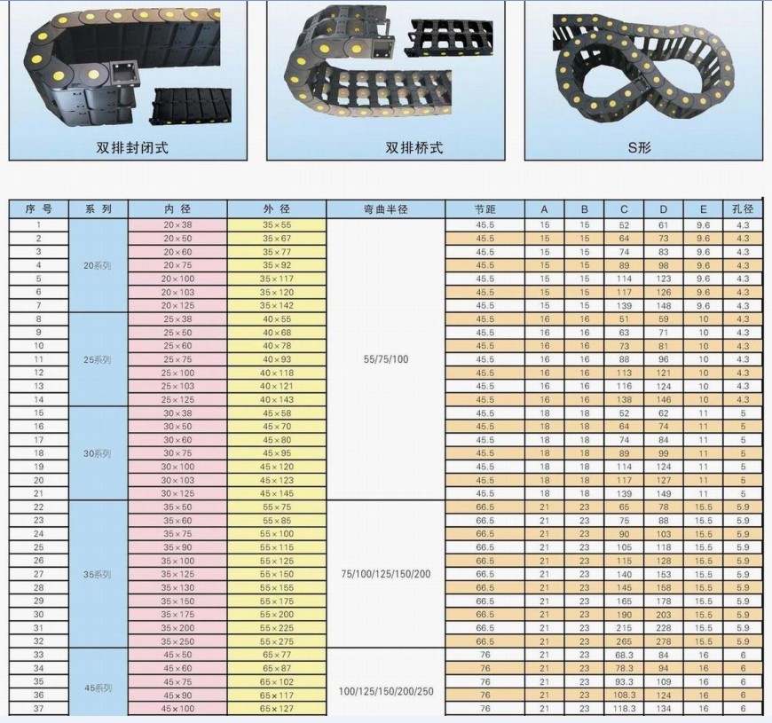 我公司大量生產(chǎn)供應長距離電纜拖鏈,該產(chǎn)品備三種結構型式:(1)全封閉式(2)半封閉式(3)橋式。該產(chǎn)品由一節(jié)節(jié)鏈板組成,彎曲半徑大小互換,用戶可自行調(diào)整長度,裝卸簡單。耐磨、耐沖擊、強度高、重量輕、適合快速移動。結構堅固,不會變形!我公司現(xiàn)有模具規(guī)格齊全,能夠滿足國內(nèi)機械行業(yè)的要求!歡迎廣大用戶來電洽談,定貨!電話:18031731008