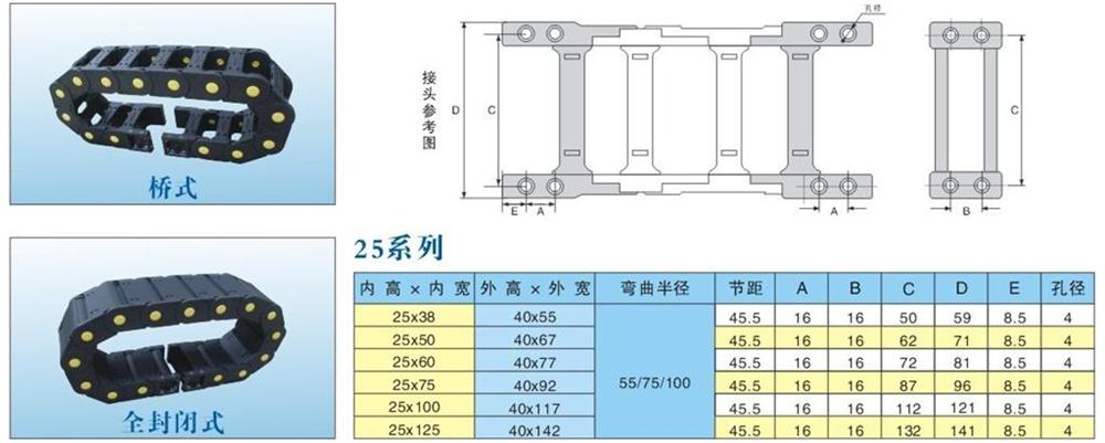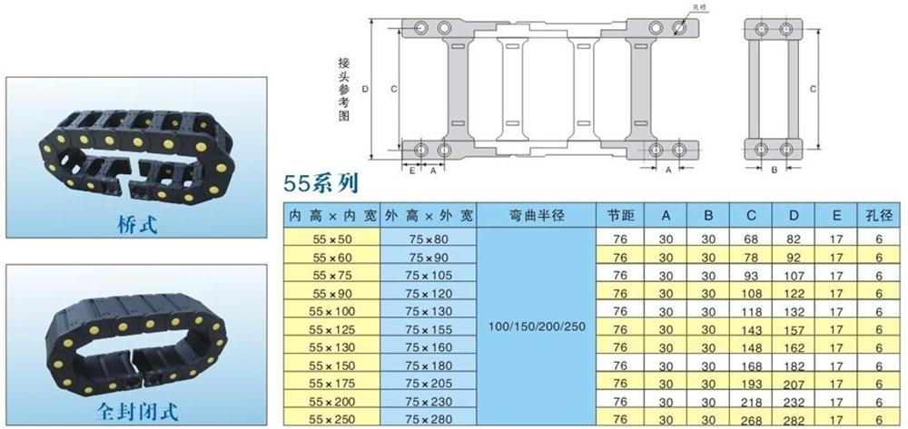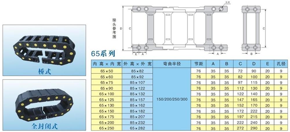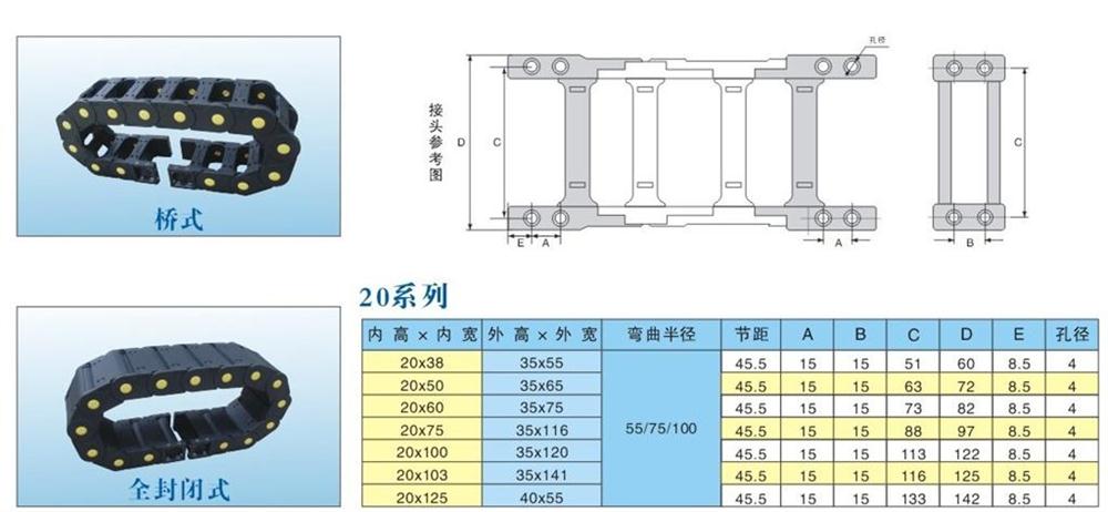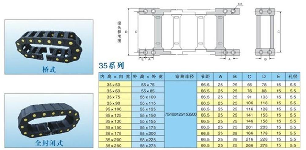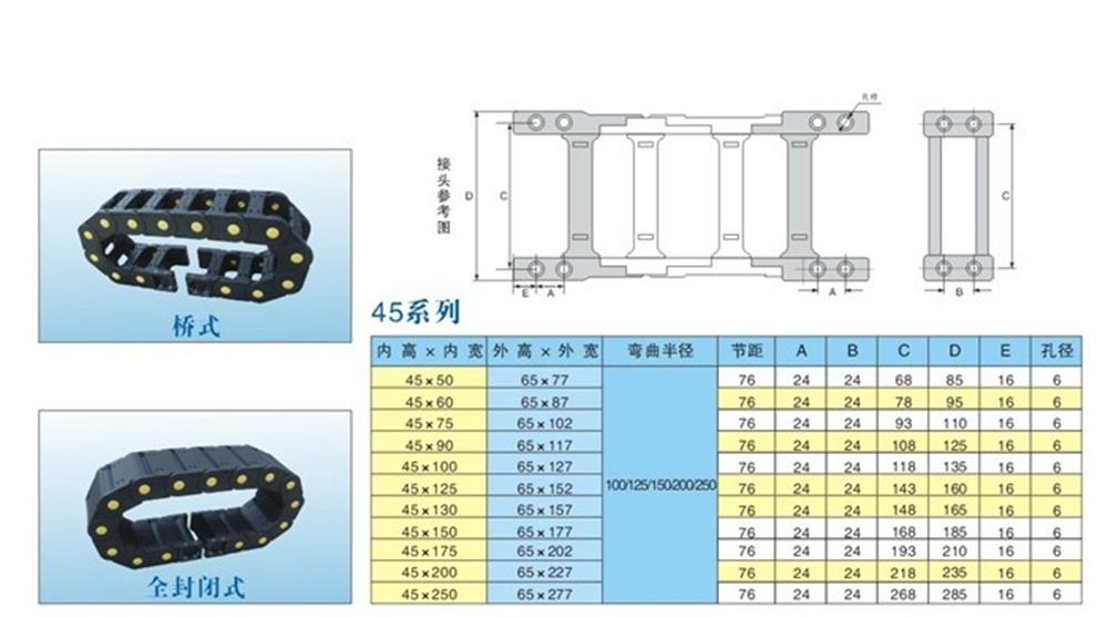 我公司大量生產(chǎn)供應(yīng)工程塑料拖鏈.,該產(chǎn)品備三種結(jié)構(gòu)型式:(1)全封閉式(2)半封閉式(3)橋式。該產(chǎn)品由一節(jié)節(jié)鏈板組成,彎曲半徑大小互換,用戶(hù)可自行調(diào)整長(zhǎng)度,裝卸簡(jiǎn)單。耐磨、耐沖擊、強(qiáng)度高、重量輕、適合快速移動(dòng)。結(jié)構(gòu)堅(jiān)固,不會(huì)變形!我公司現(xiàn)有模具規(guī)格齊全,能夠滿(mǎn)足國(guó)內(nèi)機(jī)械行業(yè)的要求!歡迎廣大用戶(hù)來(lái)電洽談,定貨!電話(huà):0317-6287811